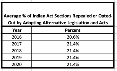 Average % of Indian Act Sections Repealed or Opted-Out by Adopting Alternative Legislation and Acts, 2020