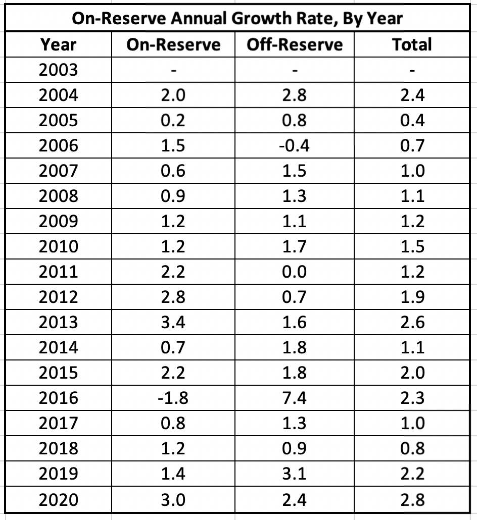 On-Reserve average Annual Growth Rate, 2016-2020